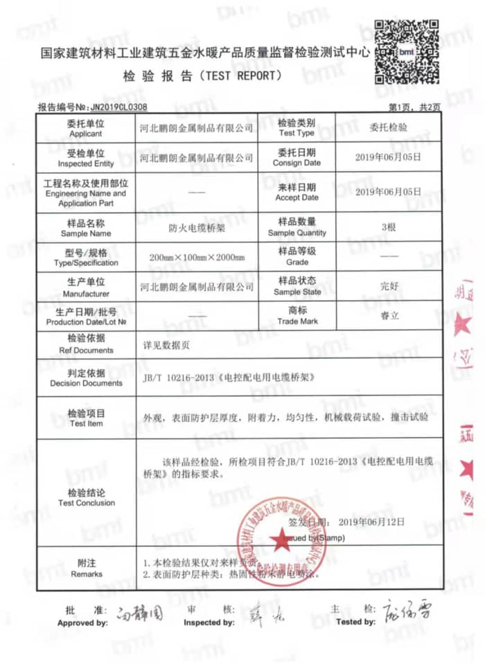 防火電纜橋架檢測報告_河北鵬朗金屬制品有限公司